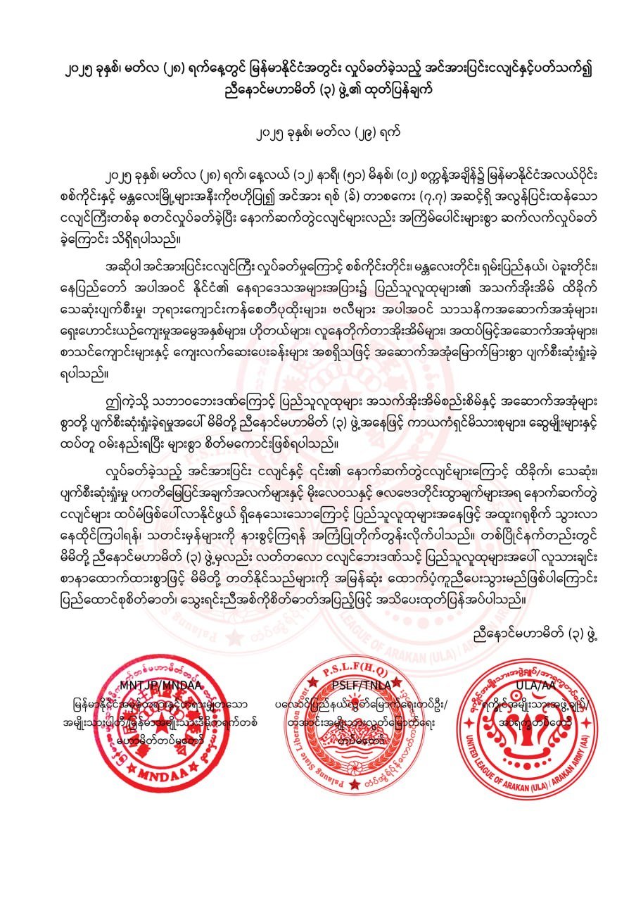 ညီနောင်မဟာမိတ် ၃ ဖွဲ့ဖြစ်တဲ့ MNDAA, TNLA နဲ့ AA က ငလျင်ဘေးဒဏ်သင့် ပြည်သူလူထုများအပေါ် လူသာခြင်း ထောက်ထားစွာနဲ့ မိမိတို့ ညီနောင်မဟာမိတ် ၃ ဖွဲ့ အနေနဲ့ တတ်နိုင်တာများကို အမြန်ဆုံး ထောက်ပံ့ပေးမယ်လို့ ဒီနေ့မှာ ထုတ်ပြန်ခဲ့ပါတယ်။