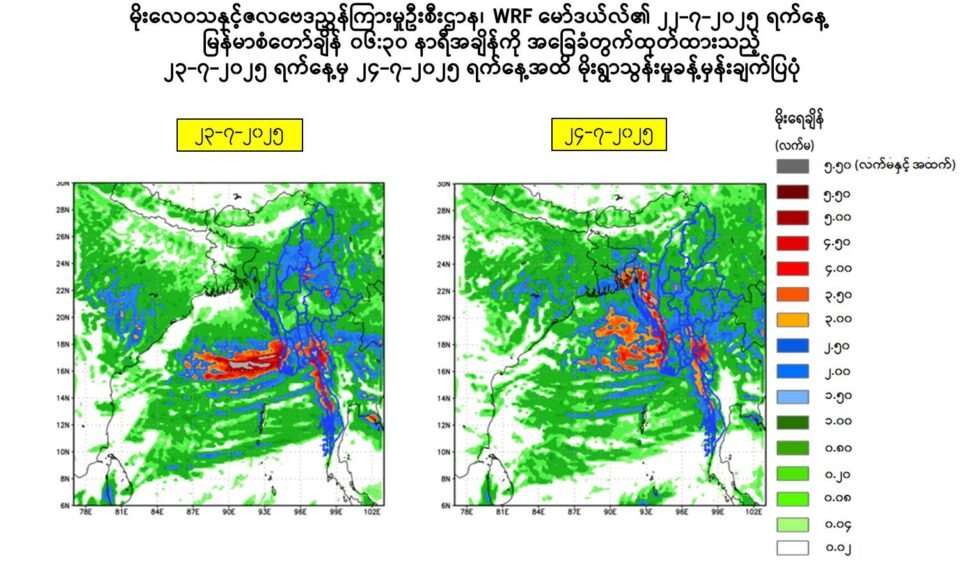 ရက္ခိုင်ပြည်တွင် ဇူလိုင်လ ၂၂ ရက် ညနေ ၆ နာရီက စတင်ပြီး ဇူလိုင်လ ၂၈ ရက်အထိ နေရာစိပ်စိပ်ကနေ နေရာအနှံ့အပြား မိုးထစ်ချုန်းရွာပြီး နေရာကွက်ကြား မိုးကြီးနိုင်တယ်လို့ မိုးလေဝသဌာနက ထုတ်ပြန်ပါတယ်။