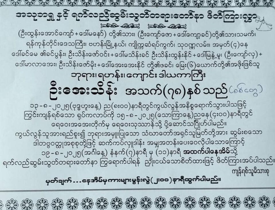 ရခိုင်အမျိုးသားပါတီက ဦးထွန်းအောင်ကျော်က “ရခိုင်အမျိုးသားပါတီရဲ့ ရခိုင်ပြည် စစ်တွေမြို့ မြို့သူကြီးရပ်ကွက် ပန်းခြံလမ်းနေ ဦးအေးသိန်း အသက် (၇၈) နှစ် ရခိုင်အမျိုးသာပါတီ ANP စစ်တွေမြို့နယ် ပါတီ ဥက္ကဋ္ဌဟောင်း သည် ၁၃-၈-၂၀၂၅ ရက်နေ့တွင် ကွယ်လွန်သွားကြောင်း ကြားသိရသည့်အတွက် ကျန်ရစ်သူ မိသားစုများနှင့်ထပ်တူ စိတ်မကောင်းဖြစ်ရသည်” လို့ သူရဲ့ လူမှုကွန်ရက်စာမျက်နှာ ရေးသားထားပါတယ်။