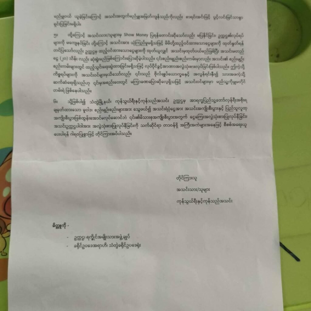 ရက္ခိုင်ပြည်၊ သံတွဲမြို့နယ်၊ ကုန်သွယ်ရေးအသင်းဥက္ကဋ္ဌကို အာရက္ခပြည်သူ့တော်လှန်ရေးအစိုးရ ချမှတ်ထားတဲ့ မူဝါဒနဲ့ စည်းမျဥ်းတွေကို သွေဖယ်ပြီး အသင်းရန်ပုံငွေကို ကိုယ်ကျိုးစီးပွားအတွက် အလွဲသုံးစားလုပ်ထားတယ်ဆိုပြီး ကုန်သွယ်ရေးအသင်းရဲ့ အသင်းသူ အသင်းသားတွေက တိုင်ကြားခဲ့တာပဲ ဖြစ်ပါတယ်။