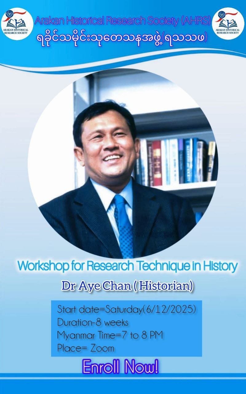 ရက္ခိုင်သမိုင်းသုတေသနအဖွဲ့ (ရသသဖ) Arakan Historical Research Society (AHRS) က ကျင်းပပြုလုပ်တဲ့ Workshop for Research Techniques in History သင်တန်းကို အထင်ကရ ရက္ခိုင်သမိုင်းပညာရှင် ဒေါက်တာအေးချမ်းက သမိုင်းသုတေသန နည်းစနစ်တိကို သင်ကြား၊ ဆွေးနွေးပေးမှာ ဖြစ်ပါတယ်။