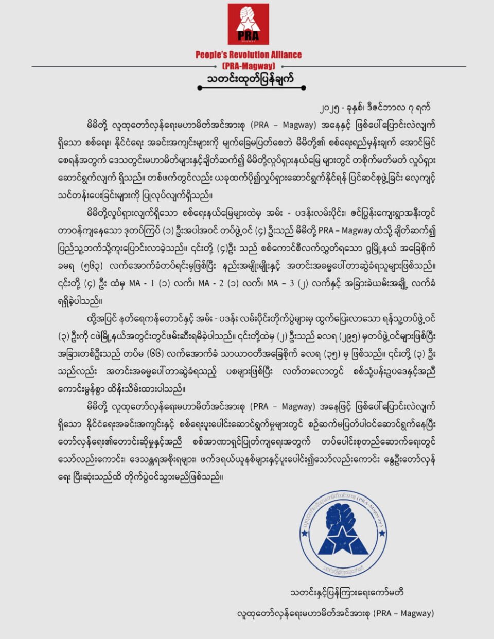 ရက္ခိုင်ပြည်၊ ဂွမြို့နယ်အခြေစိုက် ခမရ (၅၆၃) မှ စစ်ကော်မရှင် တပ်သား ၄ ဦး ဟာ လက်နက်ခဲယမ်းများနဲ့ အလင်းဝင်ခဲ့တယ်လို့ People’s Revolution Alliance (PRA-Magway) က ဒီကနေ့ (ဒီဇင်ဘာ ၇ ရက်) ညနေပိုင်းမှာ ထုတ်ပြန်ခဲ့ပါတယ်။