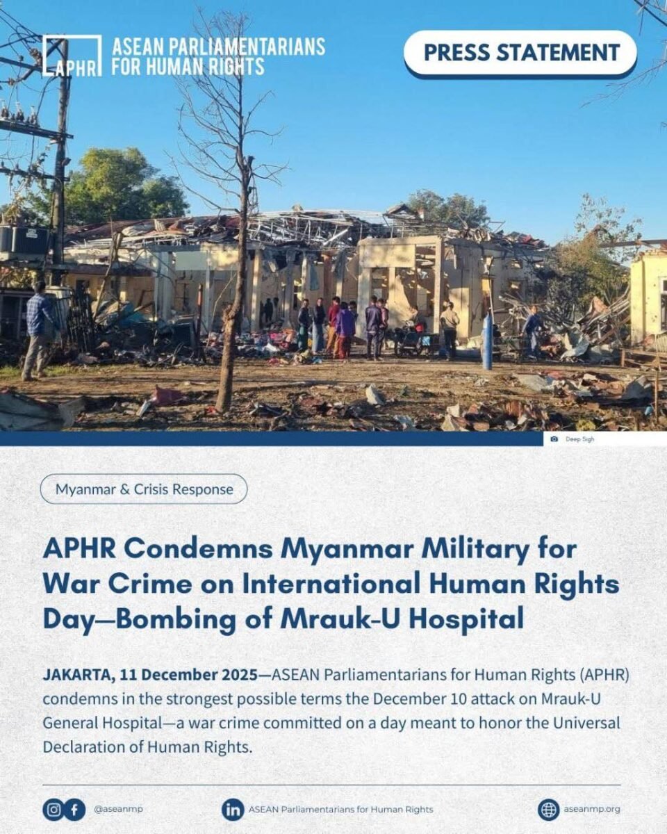 ရက္ခိုင်ပြည်၊ မြောက်ဦးဆေးရုံကို ဗုံးကြဲခဲ့မှုဟာ စစ်ကော်မရှင်ရဲ့ စစ်ရာဇဝတ်မှု ကျူးလွန်မှုဖြစ်တယ်လို့ ASEAN Parliamentarians for Human Rights -APHR က ထုတ်ပြန်ထားပါတယ်။