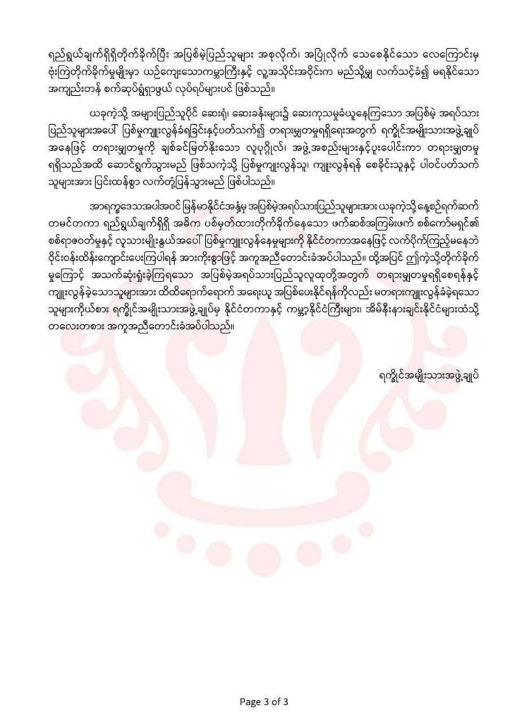 အာရက္ခဒေသအပါအဝင် မြန်မာနိုင်ငံအနှံ့မှ အပြစ်မဲ့အရပ်သားပြည်သူများအား ယခုကဲ့သို့ နေ့စဉ်ရက်ဆက် တမင်တကာ ရည်ရွယ်ချက်ရှိရှိ အဓိက ပစ်မှတ်ထားတိုက်ခိုက်နေတဲ့ ဖက်ဆစ်အကြမ်းဖက် စစ်ကော်မရှင်ရဲ့စစ်ရာဇဝတ်မှုနှင့် လူသားမျိုးနွယ်အပေါ် ပြစ်မှုကျူးလွန်နေမှုများကို နိုင်ငံတကာအနေဖြင့် လက်ပိုက်ကြည့်မနေဘဲ အသက်ဆုံးရှုံးခဲ့ကြရတဲ့ အပြစ်မဲ့အရပ်သားပြည်သူလူထုတို့အတွက် တရားမျှတမှုရရှိစေရန်နှငိ့ ကျူးလွန်ခဲ့သောသူများအား ထိထိရောက်ရောက် အရေးယူ အပြစ်ပေးနိုင်ရန်ကိုလည်း ရက္ခိုင်အမျိုးသားအဖွဲ့ချုပ်မှ နိုင်ငံတကာနှင့် ကမ္ဘာ့နိုင်ငံကြီးများ၊ အိမ်နီးနားချင်းနိုင်ငံများထံသို့ အကူအညီတောင်းခံအပ်ပါတယ်လို့ ထုတ်ပြန်ချက်မှာထည့်သွင်းတောင်းဆိုထားပါတယ်။