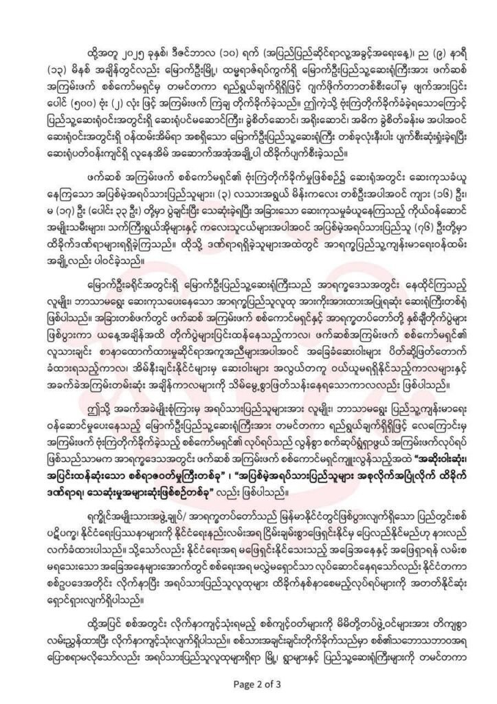 ၂၀၂၅ ခုနှစ်၊ ဇန်နဝါရီလ (၃) ရက် မှ နိုဝင်ဘာလ (၂၈) ရက်နေ့ထိ တနှစ်တာနီးပါးကာလအတွင်းမှာလည်း စစ်ကော်မရှင်မှ စစ်တွေ၊ ပေါက်တော၊ ရသေ့တောင်၊ ပုဏ္ဏားကျွန်း၊ ကျောက်တော်၊ မင်းပြား၊ မြောက်ဦး၊ အမ်း၊ တောင်ကုတ်၊ ရမ်းဗြဲ၊ ကျောက်ဖြူ၊ ဂွမြို့နယ်နှင့် ပလက်ဝ တို့မှာ လူ့အခွင့်အရေးချိုးဖောက်မှု၊ လူသားမျိုးနွယ်အပေါ် ပြစ်မှုကျူးလွန်မှု၊ စစ်ရာဇဝတ်မှုမြောက်သော လေကြောင်းတိုက်ခိုက်မှု (၉၂) ကြိမ် ပြုလုပ်ခဲ့တာကြောင့် ထိခိုက်ဒဏ်ရာရရှိတဲ့ အရပ်သားပြည်သူ စုစုပေါင်း (၅၀၂) ဦး၊ သေဆုံးခဲ့သူ စုစုပေါင်း (၁၉၂) ဦး နဲ့ လူနေအိမ် စုစုပေါင်း (၅၉၆) လုံး ပျက်စီးဆုံးရှုံးခဲ့ရတယ်လို့ ထုတ်ပြန်ထားပါတယ်။