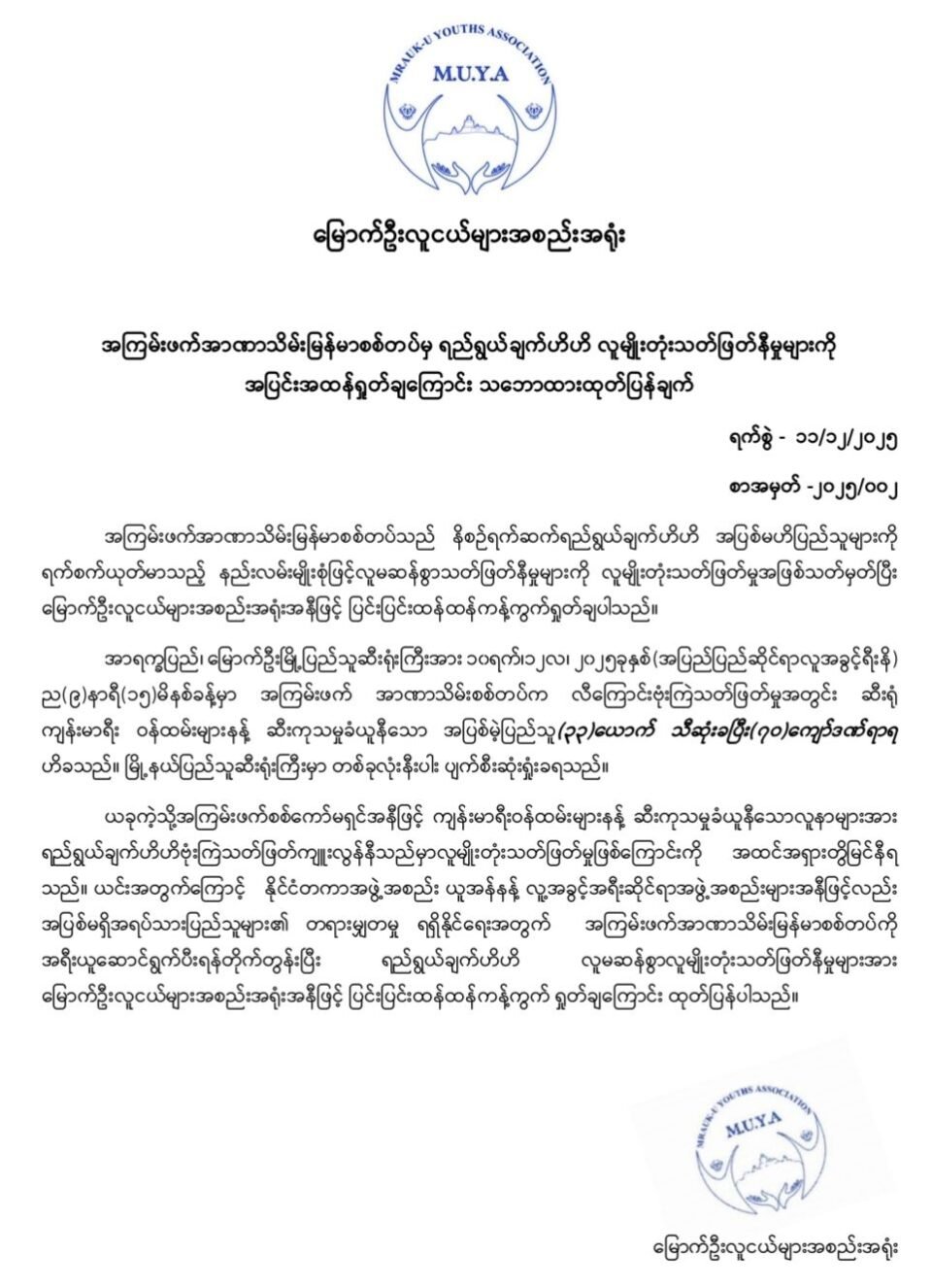 စစ်ကော်မရှင်ရဲ့ ရက္ခိုင်ပြည်၊ မြောက်ဦးဆေးရုံကို ဗုံးကြဲတိုက်ခိုက်မှုအပေါ် လူမျိုးတုံး သတ်ဖြတ်မှုအဖြစ် ရှုတ်ချကြောင်း မြောက်ဦးလူငယ်များအစည်းအရုံးကဒီဇင်ဘာ ၁၁ ရက်နေ့မှာ ထုတ်ပြန်ခဲ့ပါတယ်။