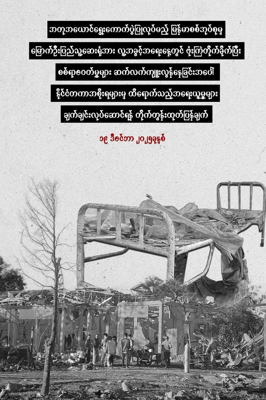 အတုအယောင် ရွေးကောက်ပွဲကို ပြည်တွင်းမှာ သေနတ်ထောက် ခြိမ်းခြောက် ဖမ်းဆီးကာ အတင်းအဓမ္မ ပြုလုပ်ရန်ကြိုးစားနေပြီး နိုင်ငံတကာ ရာဇဝတ်မှုများ ကျူးလွန်နေတဲ့ မြန်မာစစ်အုပ်စုကို ပြစ်ဒဏ်ကင်းလွတ်ခွင့် ဆက်လက်မရစေရန် နဲ့ အရပ်သားပစ်မှတ်များအပေါ် စစ်ရာဇဝတ်မှု ကျူးလွန်နေမှုများကို ချက်ချင်း ရပ်တန့်ရန် နိုင်ငံတကာအစိုးရများ အားလုံးအနေဖြင့် တစုတစည်းတည်း ပြစ်ဒဏ်ပေး အရေးယူရမယ်လို့လည်း ဆိုထားပါတယ်။