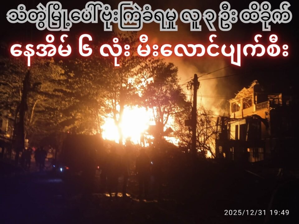 ရက္ခိုင်ပြည်၊ သံတွဲခရိုင် သံတွဲမြို့ပေါ်ကို မနေ့က ဒီဇင်ဘာ ၃၁ ရက် (နှစ်သစ်ကူးည) က ဗုံးကြဲခဲ့တဲ့ဖြစ်စဉ်မှာ လူ ၃ ဦး ထိခိုက်ဒဏ်ရာရရှိခဲ့ပြီး နေအိမ် ၆ လုံး မီးလောင်ပျက်စီးသွားတယ်လို့ သိရပါတယ်။