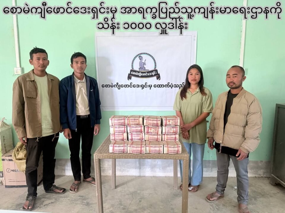 စောမဲကျီဖောင်ဒေးရှင်းအနေနဲ့ “ရက္ခိုင်ပြည်တွင်း ဆင်းရဲနွမ်းပါး ၊ ဆေးကုသရန် အခက်အခဲရှိနေတဲ့ မိသားစုများနဲ့ အာရက္ခပြည်သူ့ကျန်းမာရေးးဌာနမှ ပြည်သူ့ကျန်းမာရေးဝန်ဆောင်မှုလုပ်ငန်းများကို အားသွန်ခွန်စိုက် ဆောင်ရွက်နိုင်ရန်အတွက် အာရက္ခပြည်သူ့ကျန်းမာရေးဌာနသို့ အလှူငွေကျပ် သိန်း ၁၀၀၀ ကို စောမဲကျီဖောင်းဒေးရှင်းမှ လှူဒါန်းလိုက်ပါတယ်” လို့ ဆိုပါတယ်။
