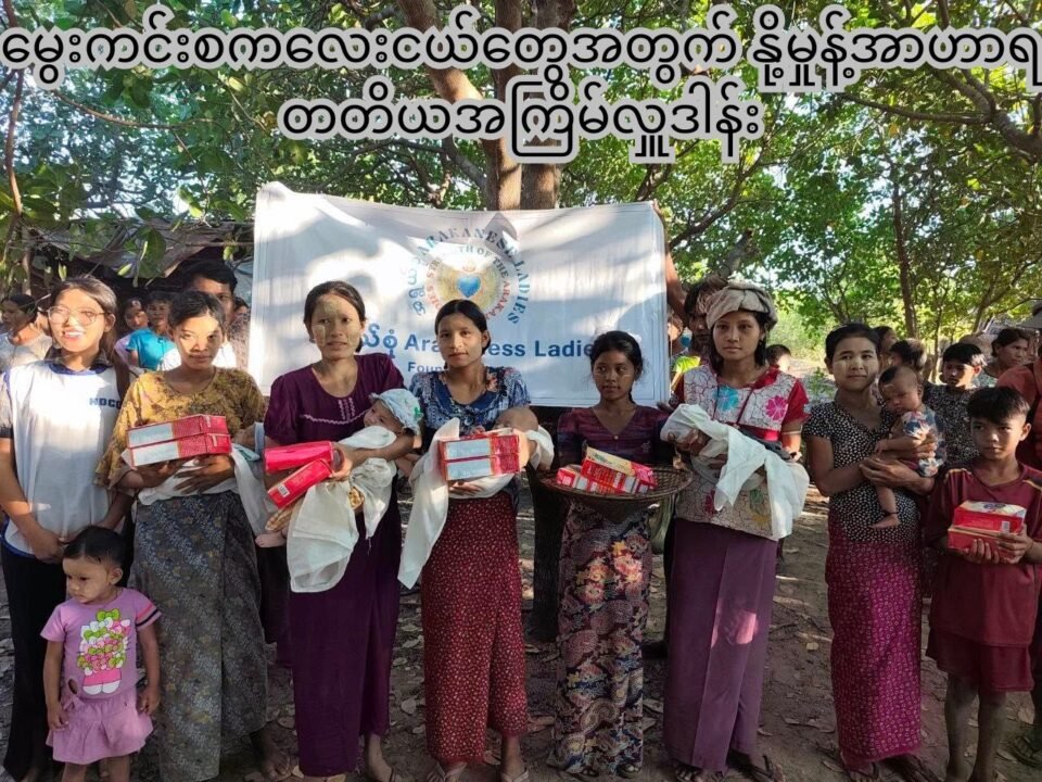 ရက္ခိုင်ပြည် ကျောက်ဖြူမြို့နယ်ရှိ စစ်ဘေးရှောင်စခန်းနေ မွေးကင်းစကလေးငယ်တွေအတွက် နို့မှုန့်အာဟာရကို တတိယအကြိမ်အဖြစ် အရွယ်စုံ Arakanese Ladies က လှူဒါန်းခဲ့တယ်လို့ သိရပါတယ်။