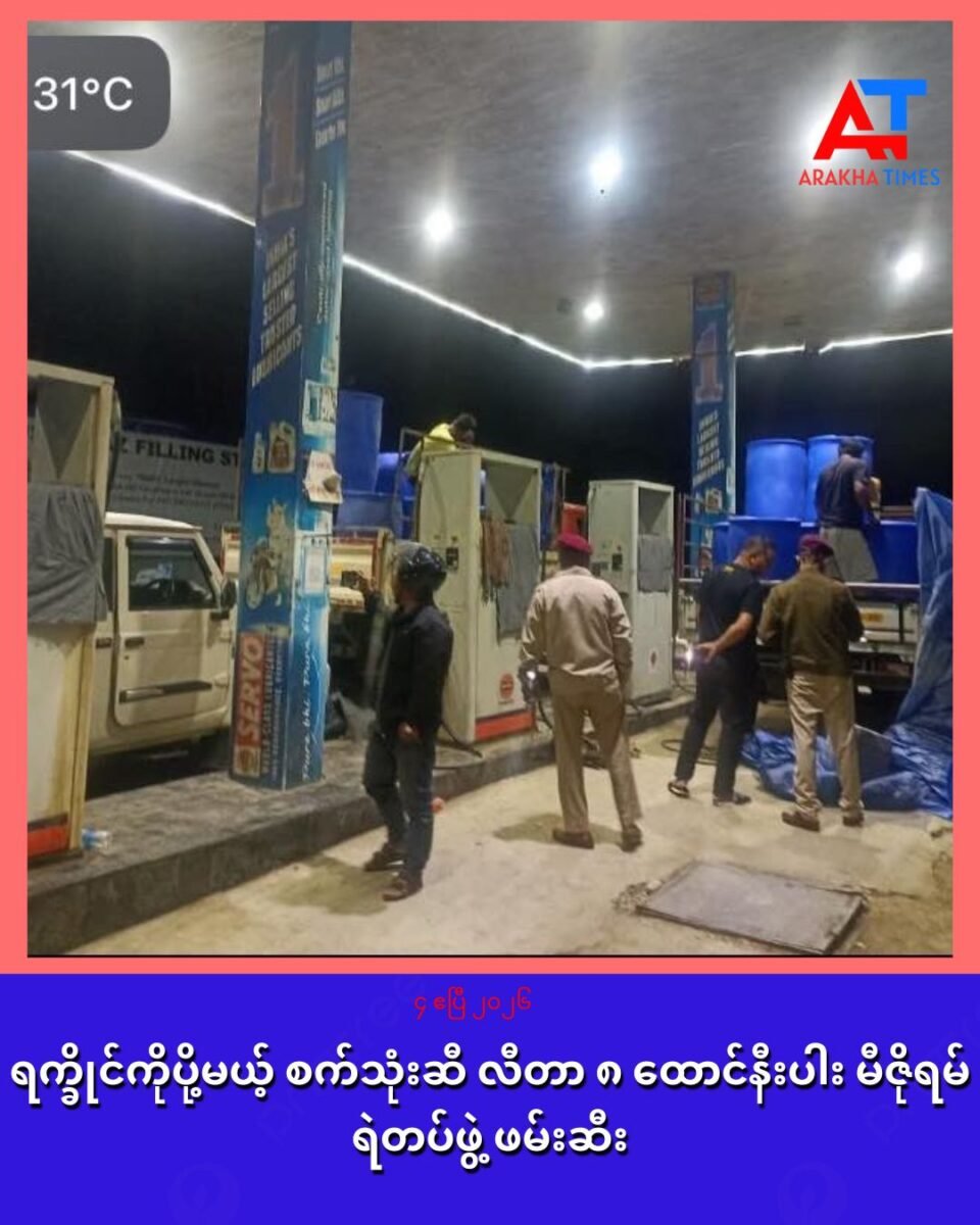 အိန္ဒိယနိုင်ငံ လုံးလေမြို့ပေါ်ရှိ “ Jedaz” စက်သုံးဆီ အရောင်းဆိုင်တွင် ရက္ခိုင်နဲ့ ချင်းပြည်ကို ပို့ဆောင်မယ့် စက်သုံးဆီများ ဖြည့်တင်းနေတယ်လို့ တိုင်ကြားချက်ကြောင့် ရဲတပ်ဖွဲ့က ဝင်ရောက်စစ်ဆေး ဖမ်းဆီးခဲ့တာလို့လည်း သိရပါတယ်။