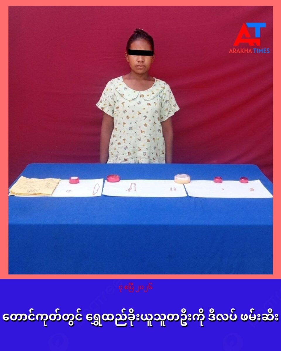 ရွှေထည်ပစ္စည်း ခိုးယူမှုနဲ့ ဖမ်းဆီးခံရသူမှာ ရက္ခိုင်ပြည် တောင်ကုတ်မြို့နယ် တန်းလွဲရွာမ အမှတ် ၁ ရပ်ကွက်နေ အသက် ၂၀ အရွယ် မိပြုံးချို ဖြစ်တယ်လို့ သိရပါတယ်။