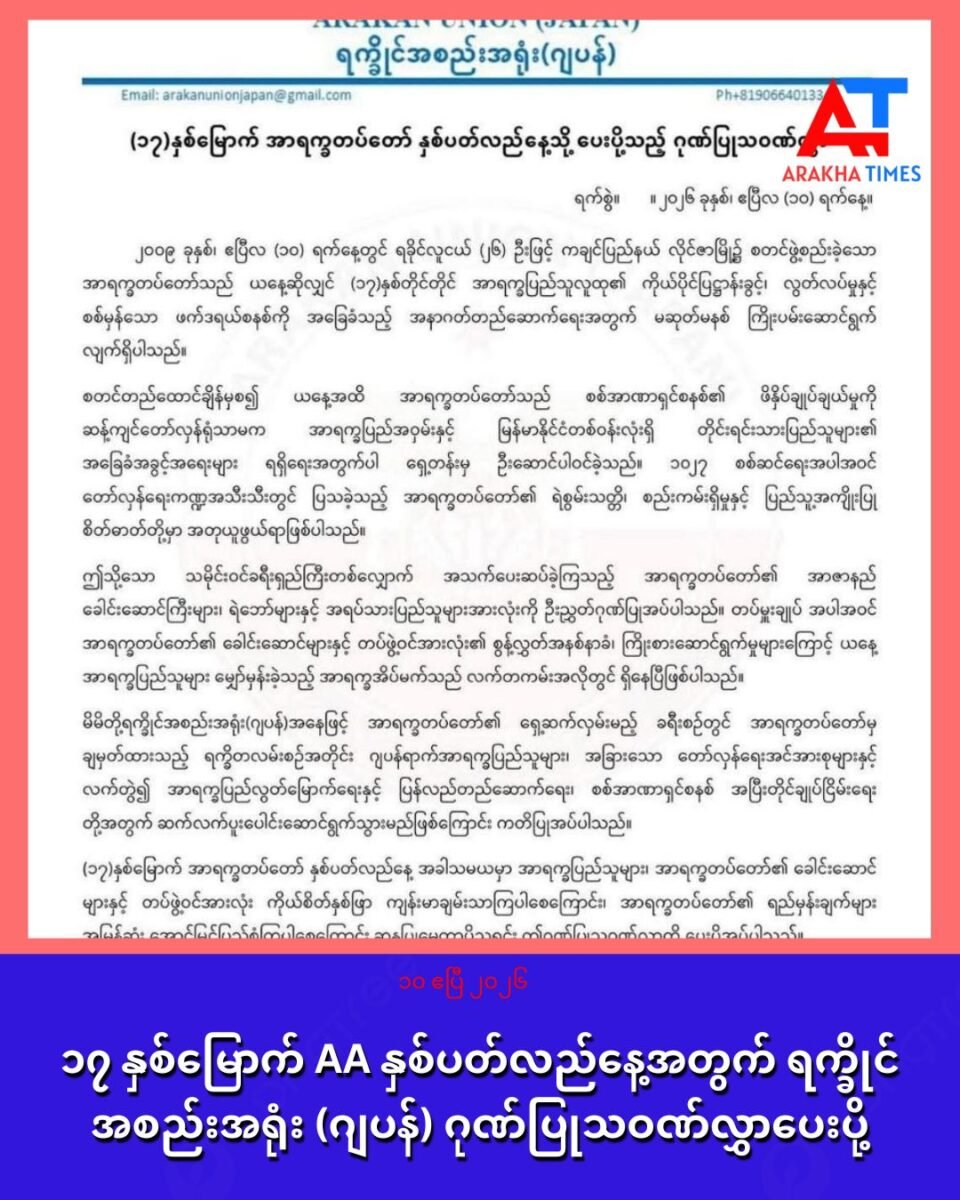 ဒီကနေ့မှာ ကျရောက်တဲ့ ၁၇ နှစ်မြောက် အာရက္ခတပ်တော် နှစ်ပတ်လည်နေ့အတွက် ရက္ခိုင်အစည်းအရုံး (ဂျပန်) က ဂုဏ်ပြုသဝဏ်လွှာ ပေးပိုခဲ့ပါတယ်။