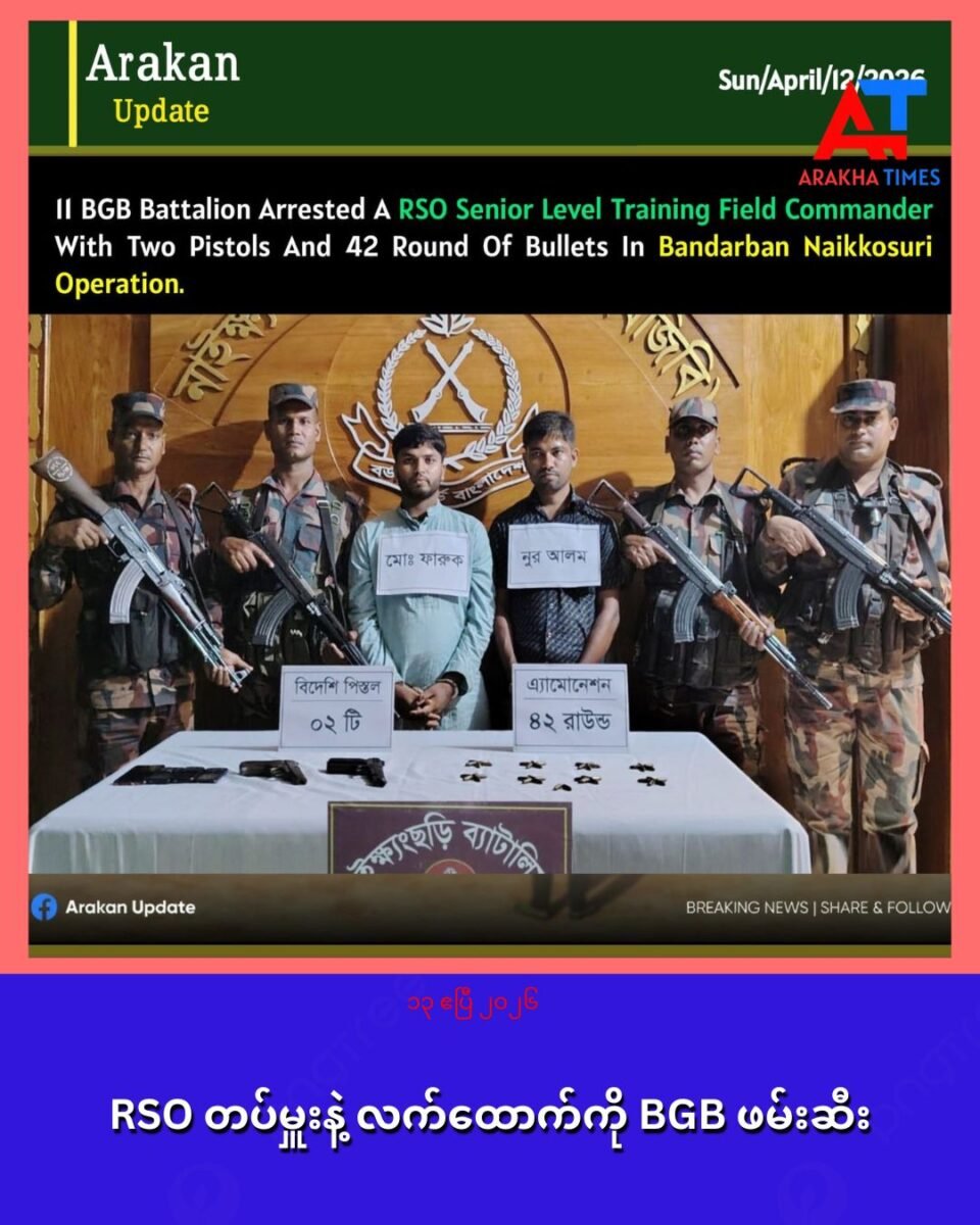 RSO (Rohingya Solidarity Organization) တပ်မှူးနဲ့ လက်ထောက်တဦးကို ဘင်္ဂလားဒေ့ရှ် နယ်ခြားစောင့်တပ် (BGB) က ဧပြီလ ၁၁ ရက်က ဖမ်းဆီးရမိခဲ့တယ်လို့ ဧပြီလ ၁၂ ရက်မှာ သတင်းထုတ်ပြန်ခဲ့ပါတယ်။
