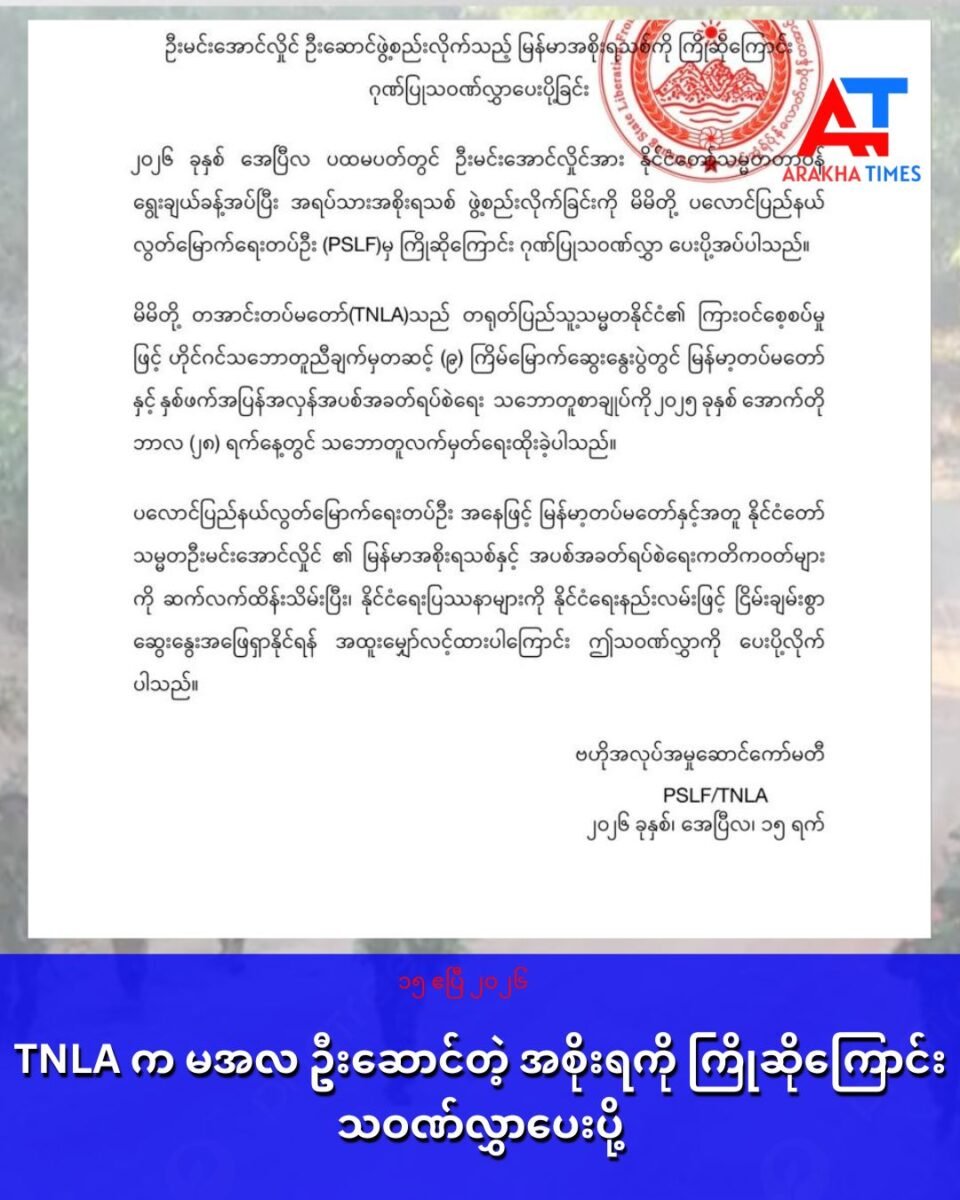 “ ၂၀၂၆ ခုနှစ် ဧပြီလ ပထမအပတ်တွင် ဦးမင်းအောင်လှိုင်အား နိုင်ငံတော်သမ္မတတာဝန် ရွေးချယ်ခန့်အပ်ပြီး အရပ်သားအစိုးရသစ် ဖွဲ့စည်းလိုက်ခြင်းကို မိမိတို့ ပလောင်ပြည်နယ်လွတ်မြောက်ရေးတပ်ဦး (PSLF) မှ ကြိုဆိုကြောင်း ဂုဏ်ပြုသဝဏ်လွှာ ပေးပို့အပ်ပါသည်” လို့ ဆိုပါတယ်။