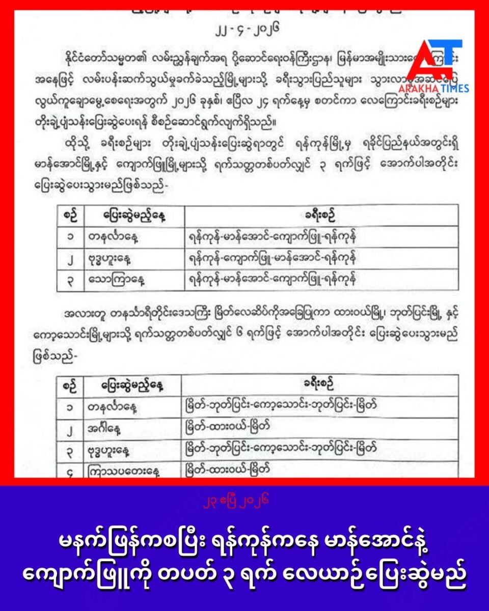 ပြေးဆွဲမယ့်နေ့နဲ့ ခရီးစဉ်တွေကတော့ တနင်္လာနေ့တွင် ရန်ကုန်-မာန်အောင်-ကျောက်ဖြူ-ရန်ကုန် ဖြစ်ပြီး ဗုဒ္ဓဟူးနေ့မှာတော့ ရန်ကုန်-ကျောက်ဖြူ-မာန်အောင်-ရန်ကုန်ဖြစ်ကာ သောကြာနေ့မှာတော့ ရန်ကုန်-မာန်အောင်-ကျောက်ဖြူ-ရန်ကုန် ပြေးဆွဲမယ်လို့ သိရပါတယ်။