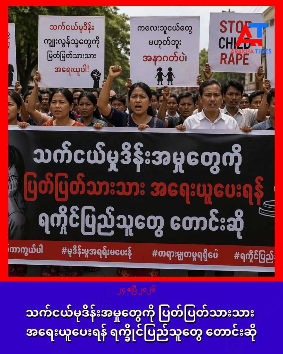 ရက္ခိုင်ပြည် မောင်တော နဲ့ မြောက်ဦးတို့တွင် သက်ငယ်မုဒိန်းမှုနဲ့ ကလေးသူငယ်များကို မဖွယ်မရာ ပြုမူမှုများ ပေါ်ပေါက်လာပြီးနောက် တရားခံတွေကို ပြတ်ပြတ်သားသား အရေးယူပေးရန် ရက္ခိုင်ပြည်သူတွေက တောင်းဆိုလာပါတယ်။
