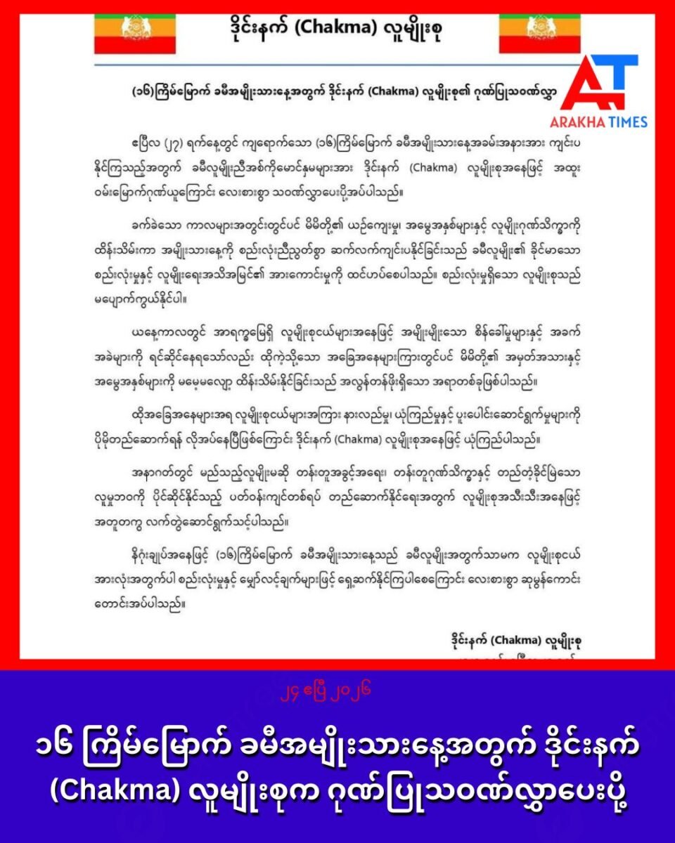 “ ယနေ့ကာလတွင် အာရက္ခမြေရှိ လူမျိုးစုငယ်များအနေနဲ့ အမျိုးမျိုးသော စိန်ခေါ်မှုများနဲ့ အခက်အခဲများကို ရင်ဆိုင်နေရသော်လည်း မိမိရဲ့ အမှတ်အသားနဲ့ အမွေအနှစ်များကို မမေ့မလျော့ ထိန်းသိမ်းနိုင်ခြင်းဟာ အလွန်တန်ဖိုးရှိတဲ့ အရာတခုဖြစ်တယ်” လို့လည်း သဝဏ်လွှာမှာ ဆိုထားပါတယ်။