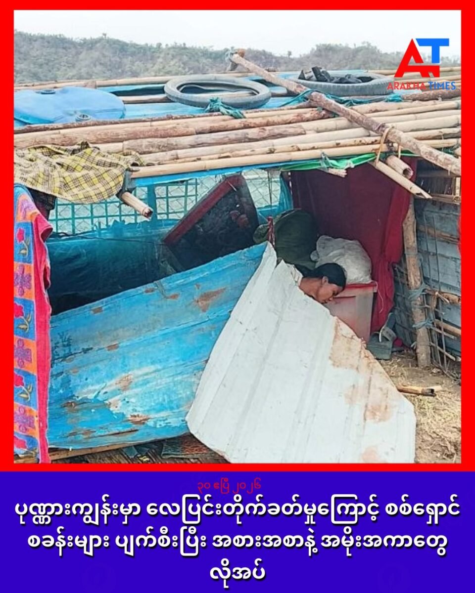 ရက္ခိုင်ပြည် ပုဏ္ဏားကျွန်းမြို့နယ်မှာ လေပြင်းတိုက်ခတ်ခဲ့တာကြောင့် စစ်ရှောင်စခန်းများ ပျက်စီးပြီး အစားအစာနဲ့ အမိုးအကာတွေ လိုအပ်နေတယ်လို့